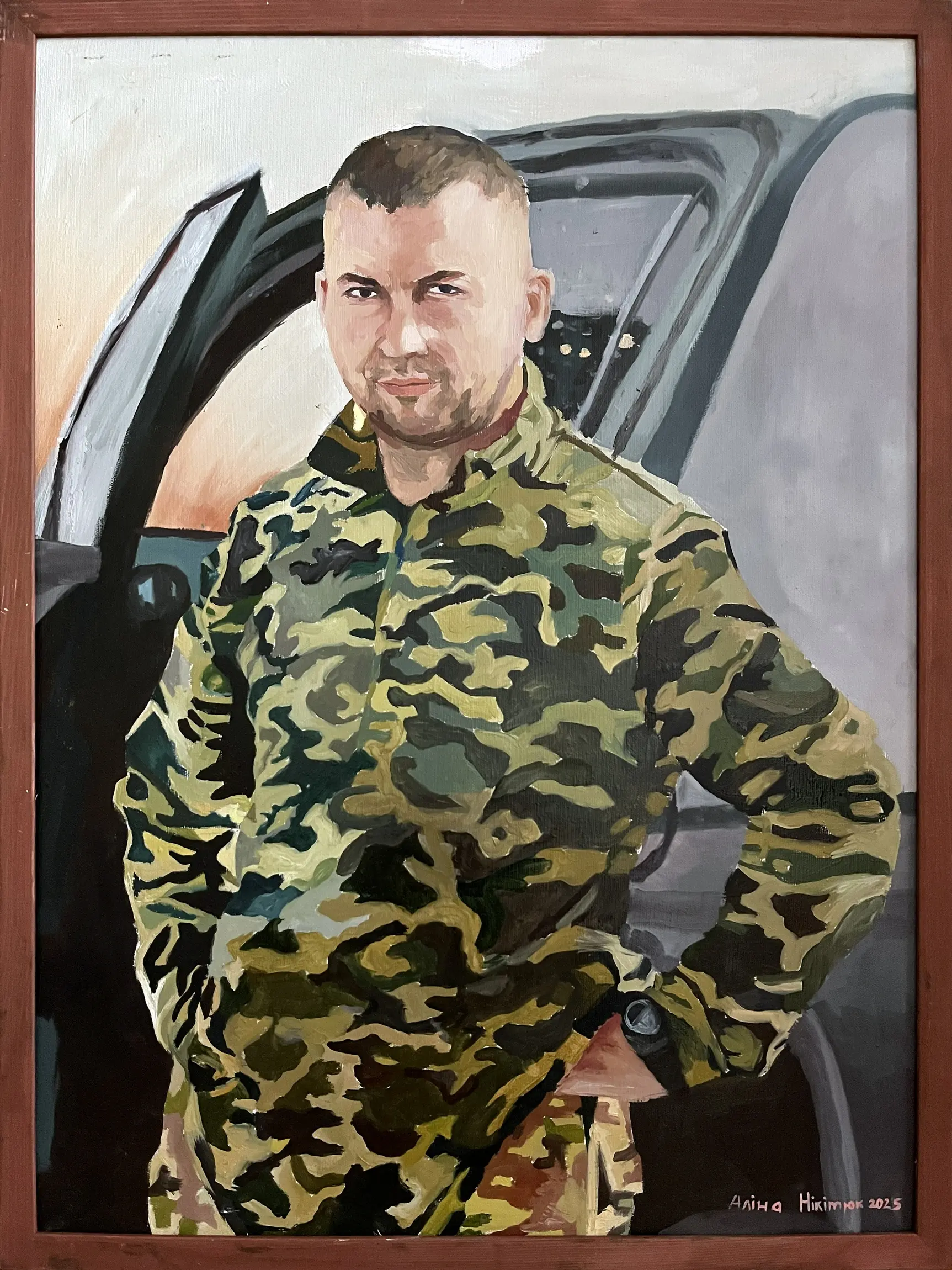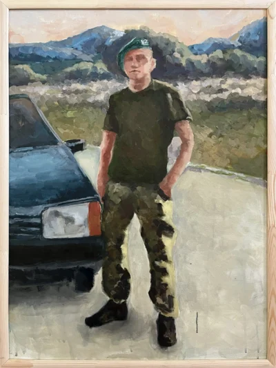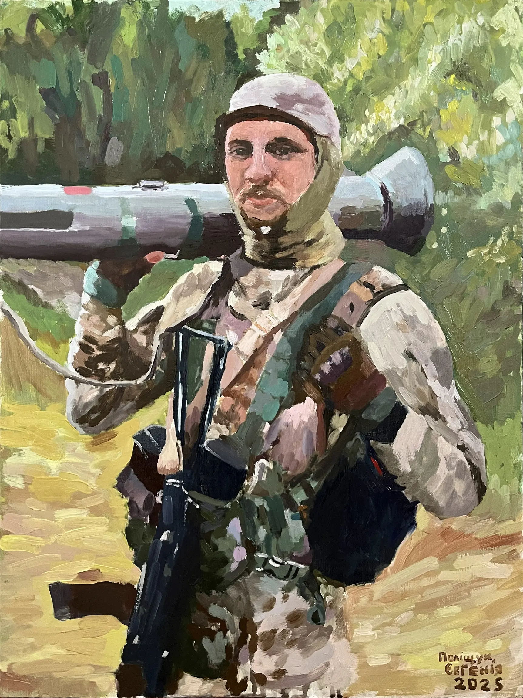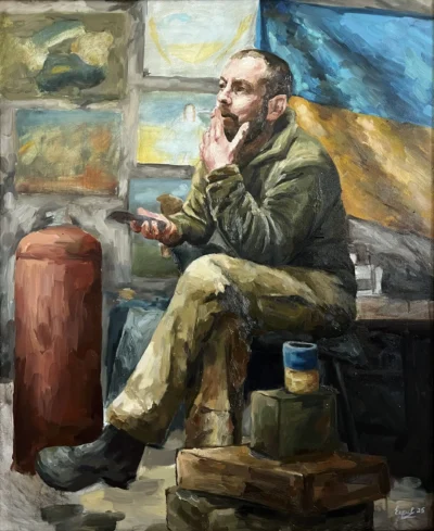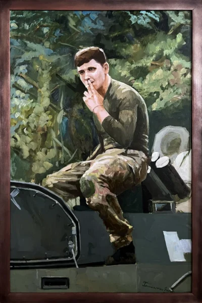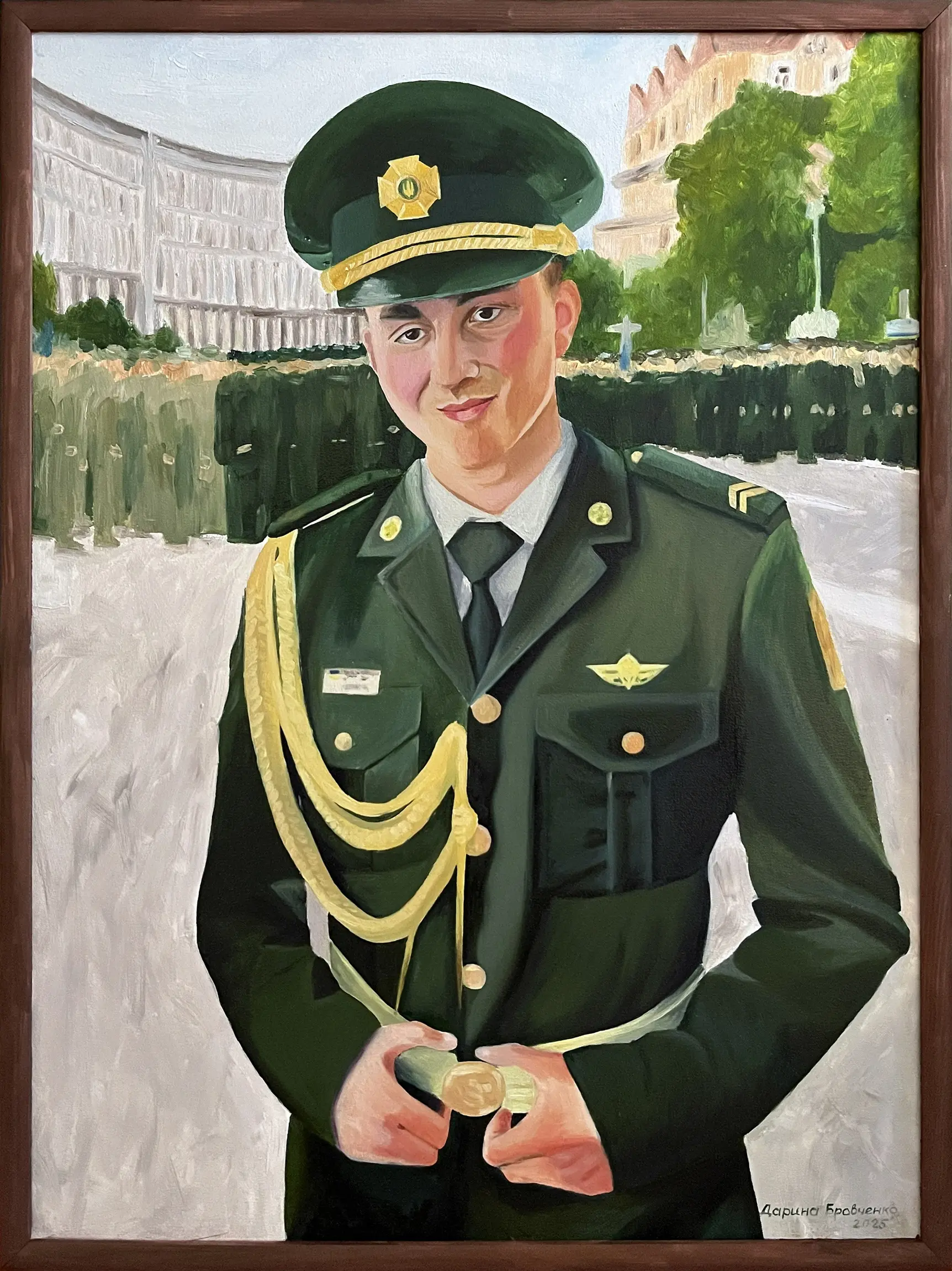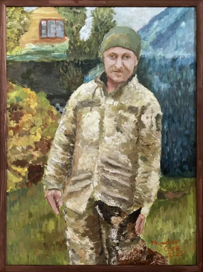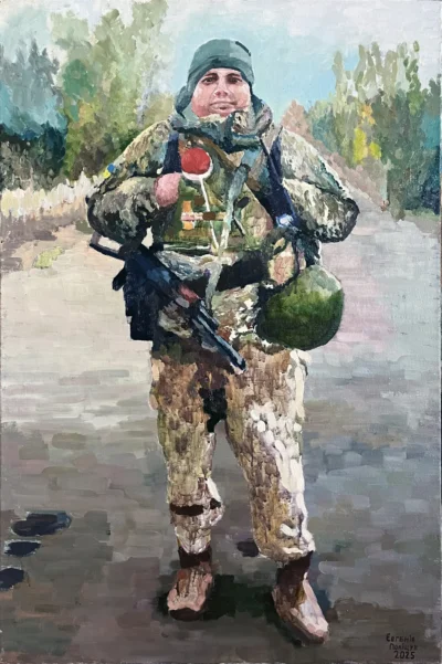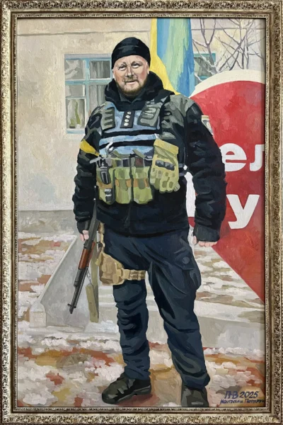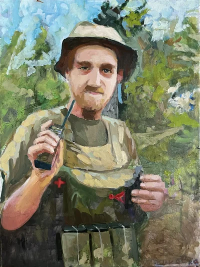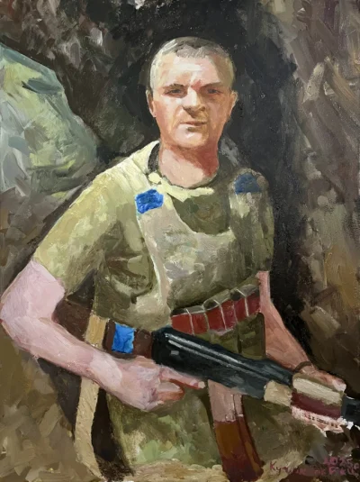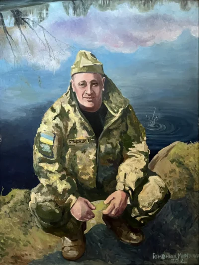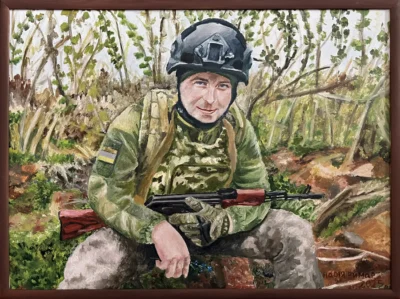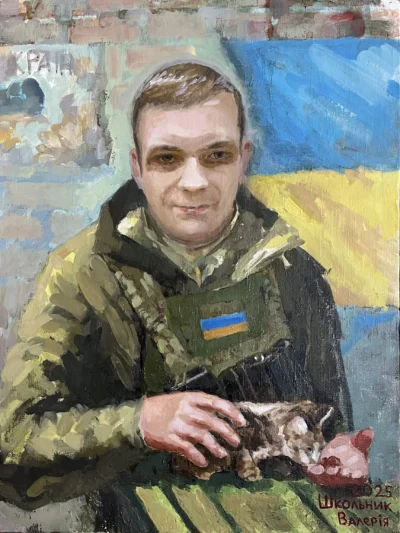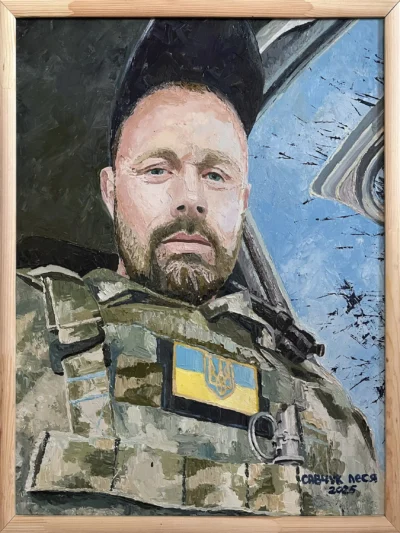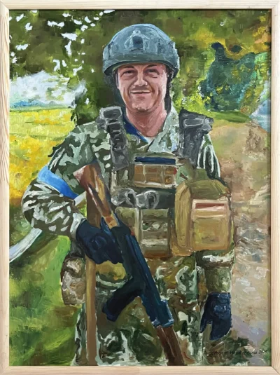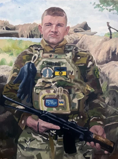 Суворий, дисциплінований, відповідальний, добрий, працелюбний, освічений, організований і сильний духом. Так пишуть про Олександра Олександровича Сербієнка. Люблячий батько та чоловік, просто хороша людина. Я мала честь відтворити його образ на полотні як Героя війни, як людину, що захищала територіальну цілісність України, була вірна військовій присязі, яка не побоялася і стала захищати свою сімʼю, свою країну, кожного з нас до останнього.