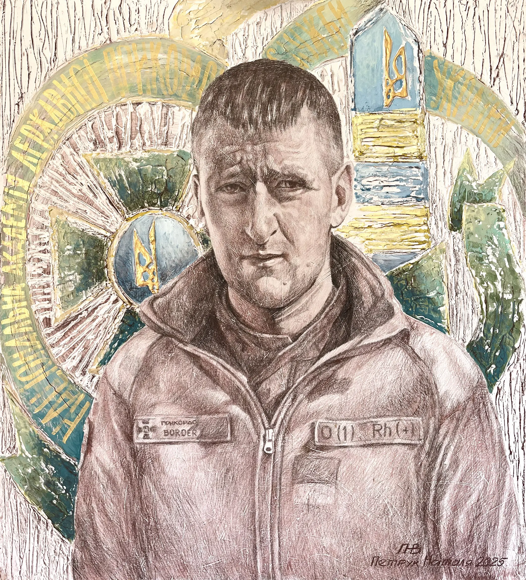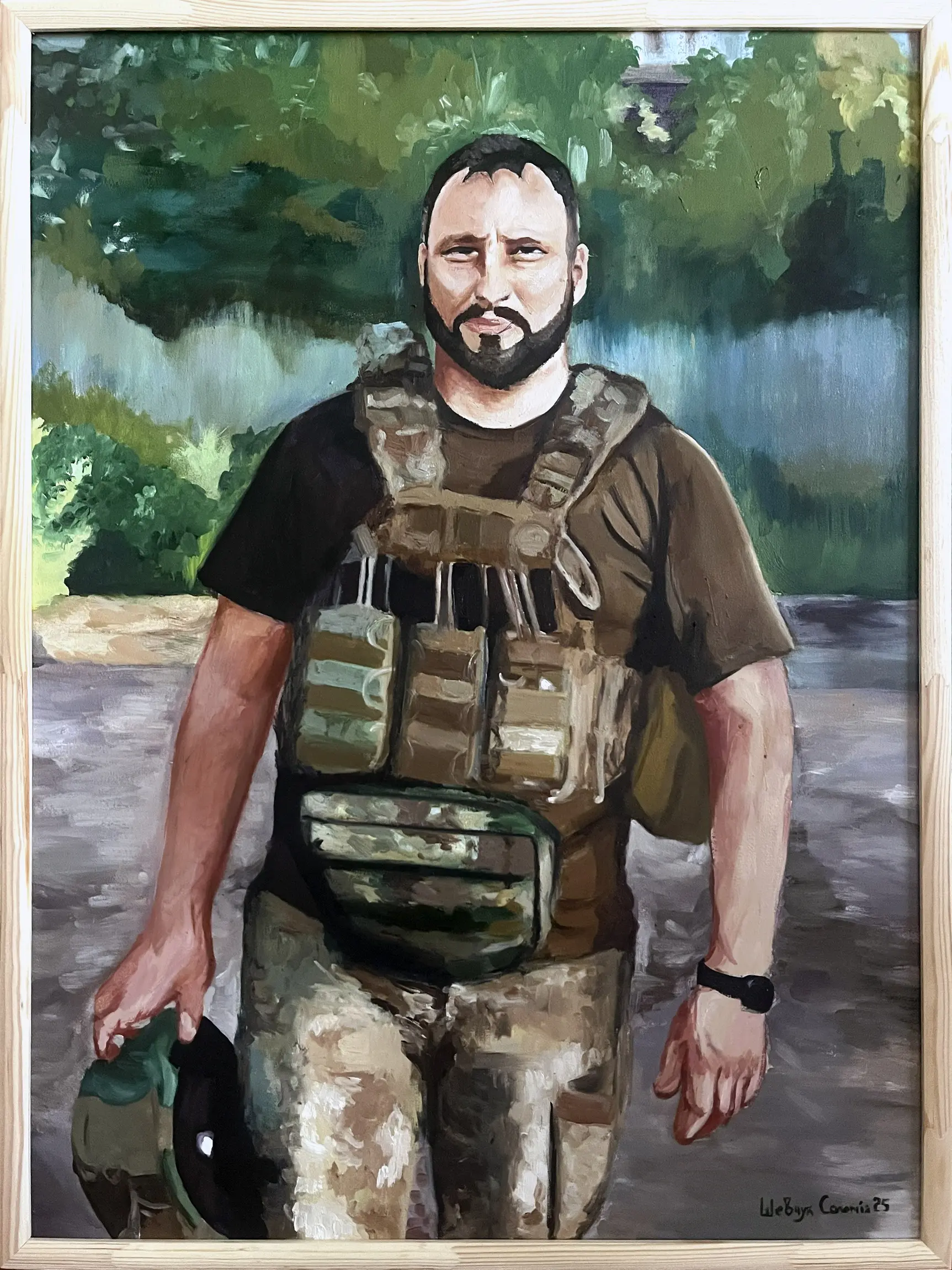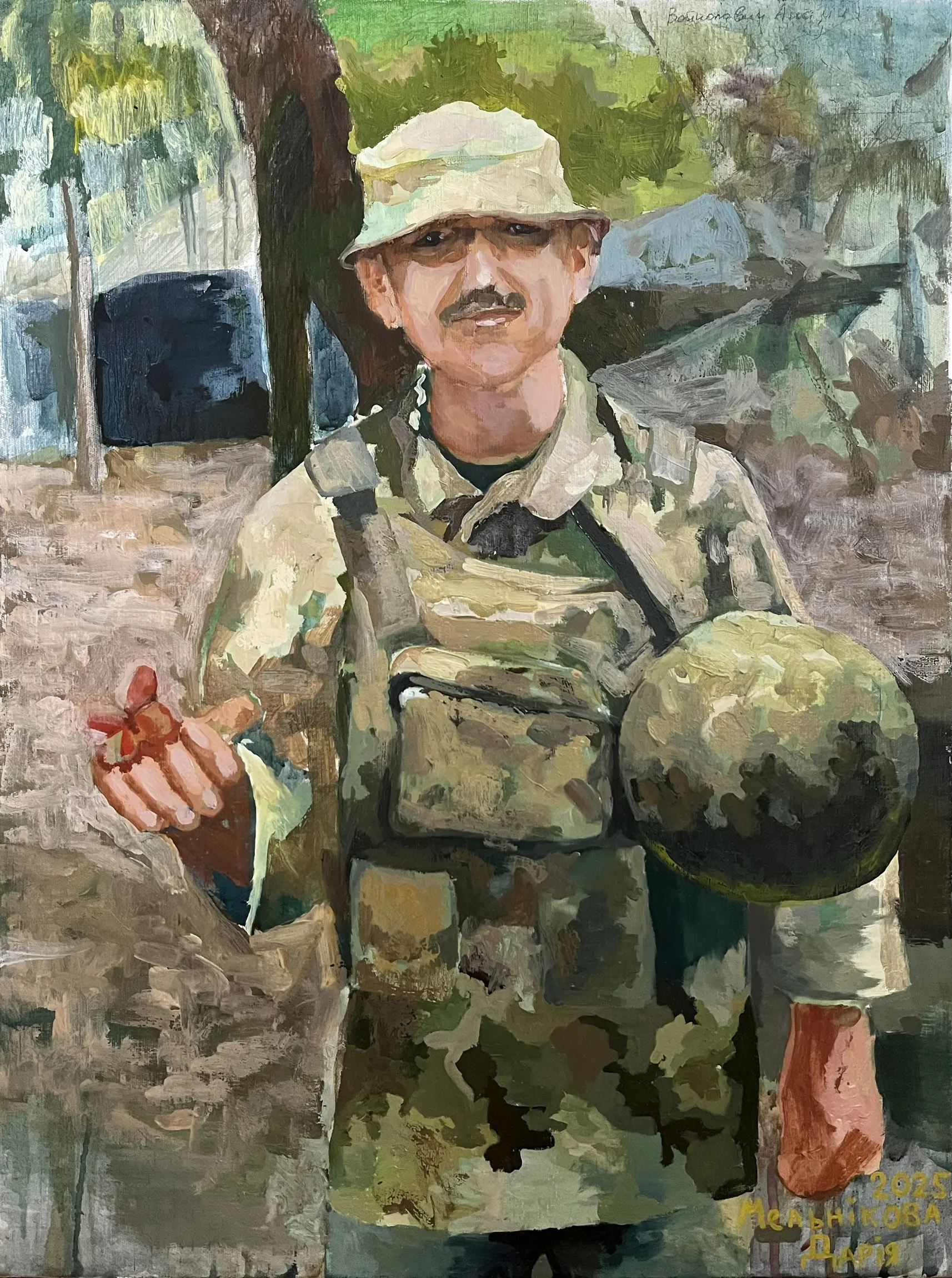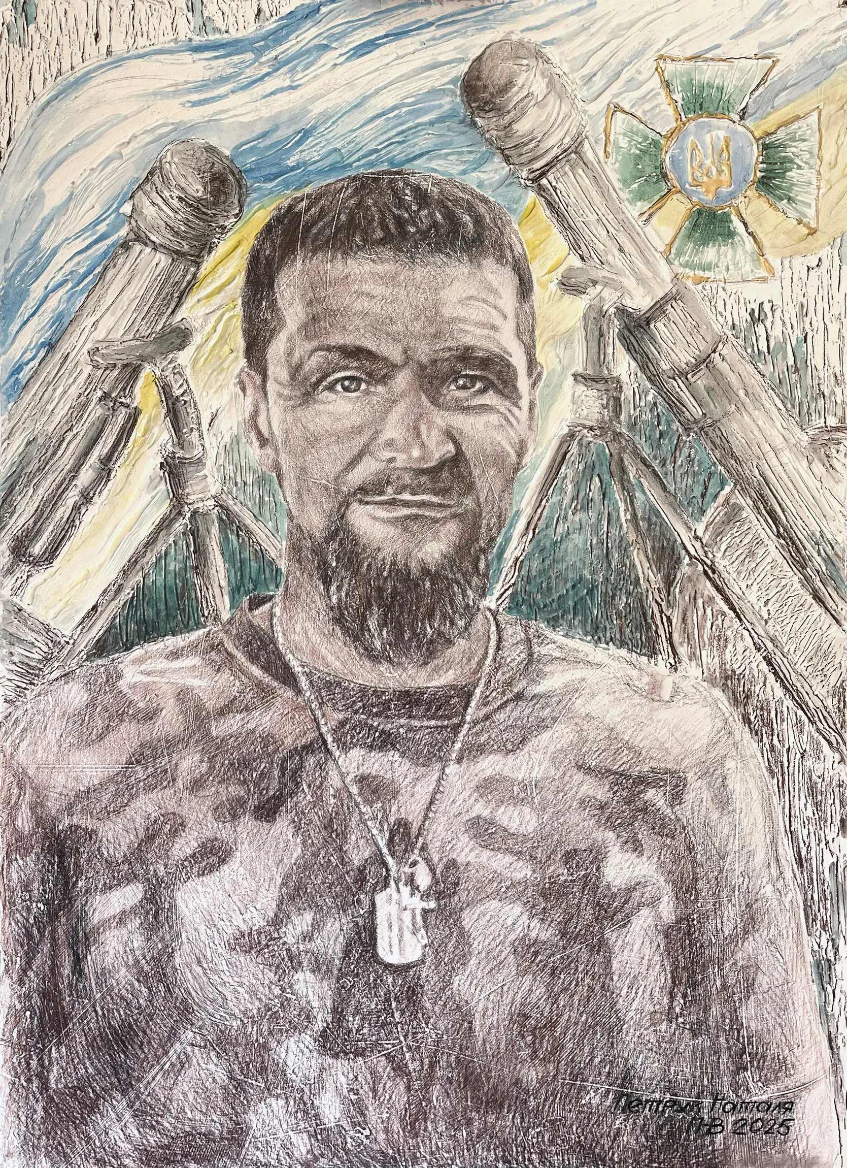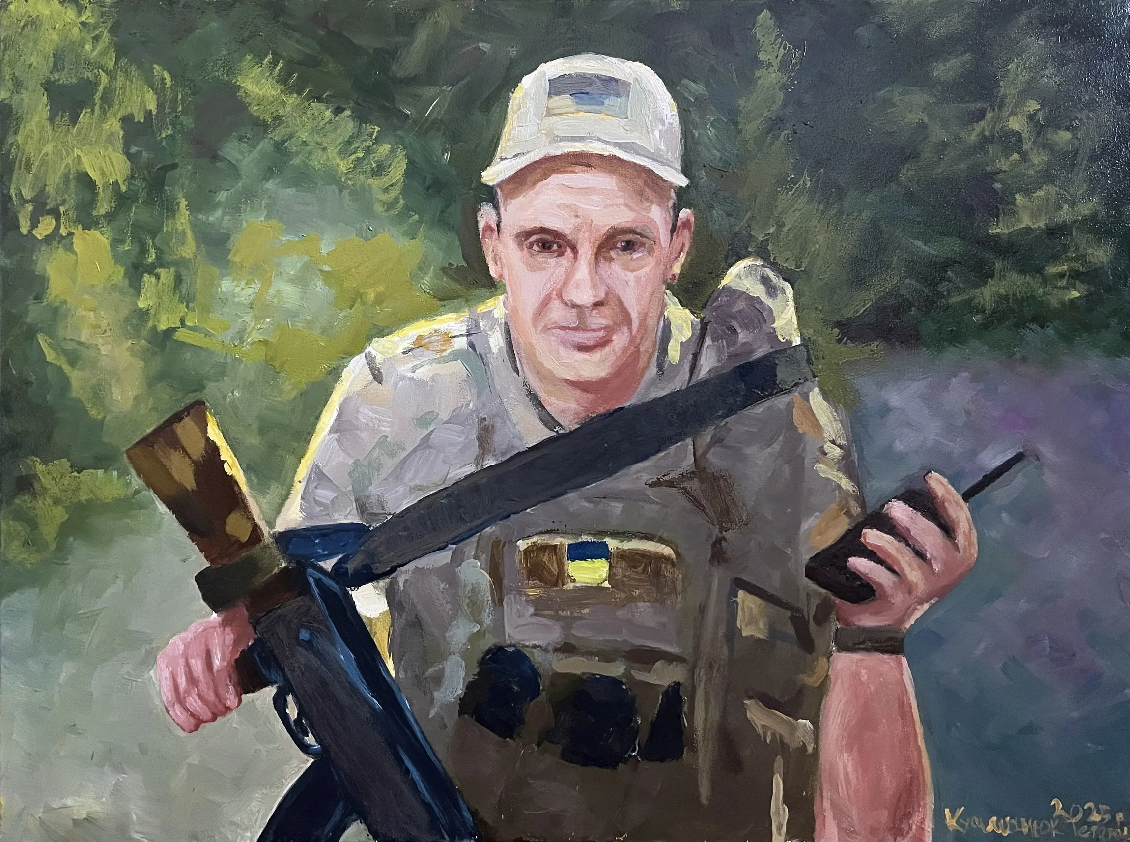 Суворий, дисциплінований, відповідальний, добрий, працелюбний, освічений, організований і сильний духом. Так пишуть про Олександра Олександровича Сербієнка. Люблячий батько та чоловік, просто хороша людина. Я мала честь відтворити його образ на полотні як Героя війни, як людину, що захищала територіальну цілісність України, була вірна військовій присязі, яка не побоялася і стала захищати свою сімʼю, свою країну, кожного з нас до останнього.