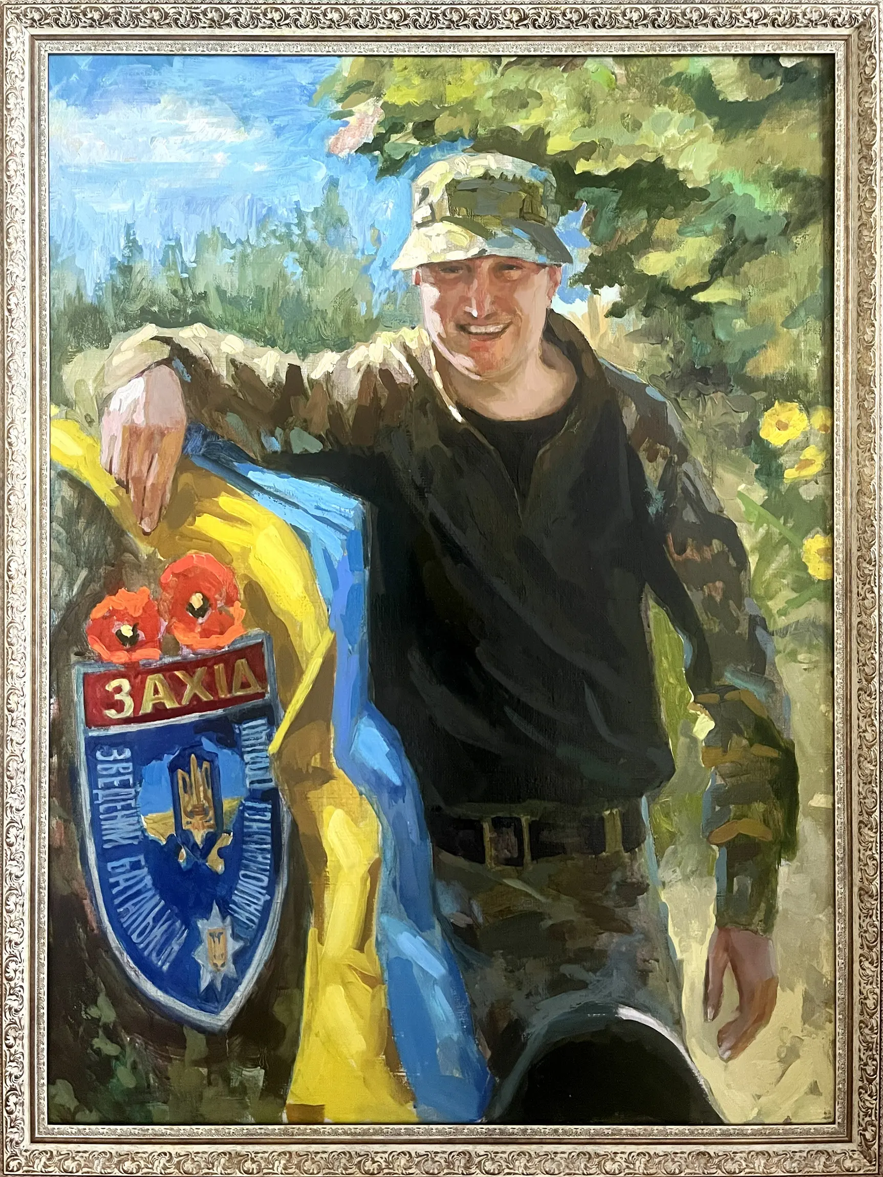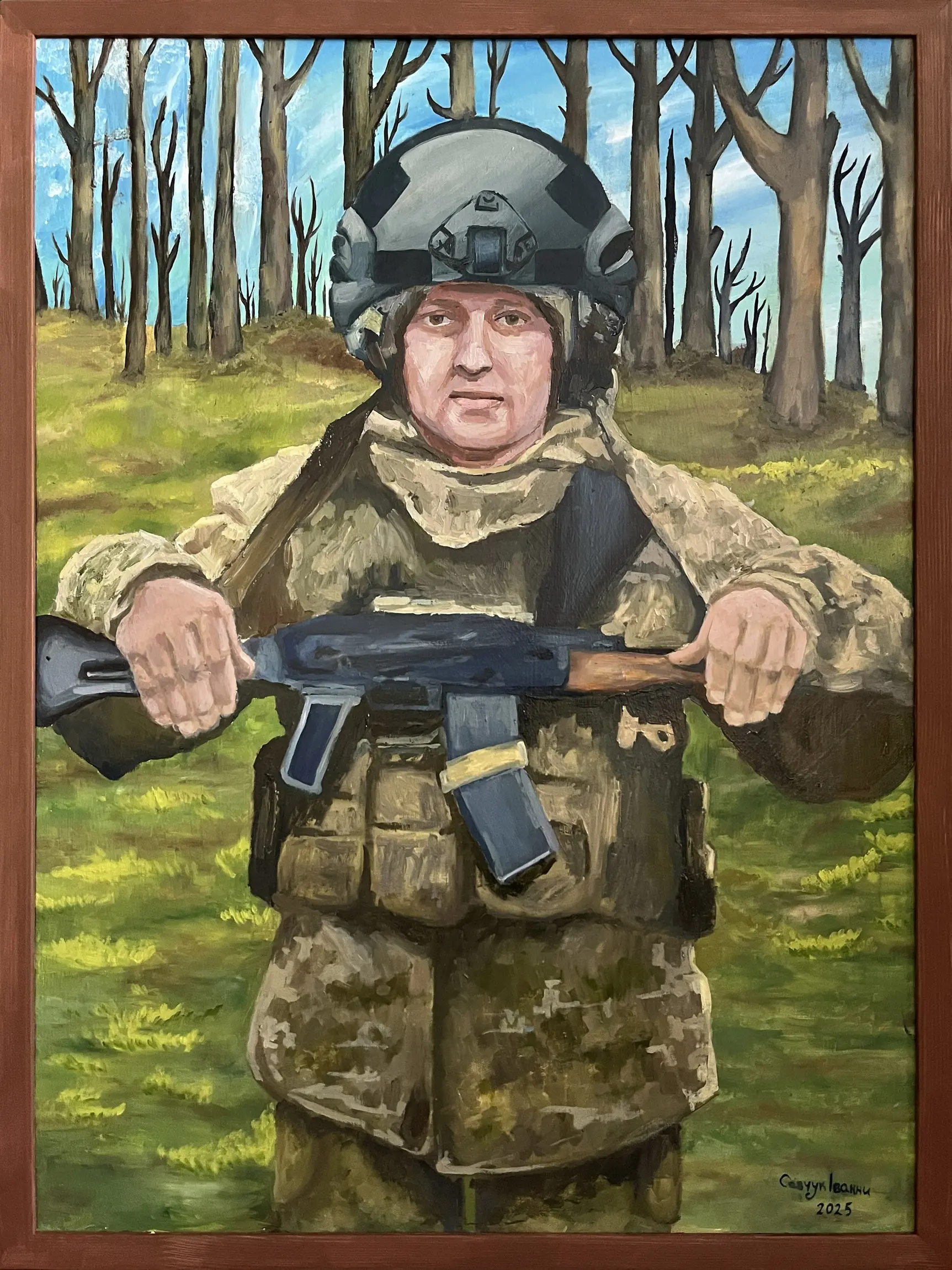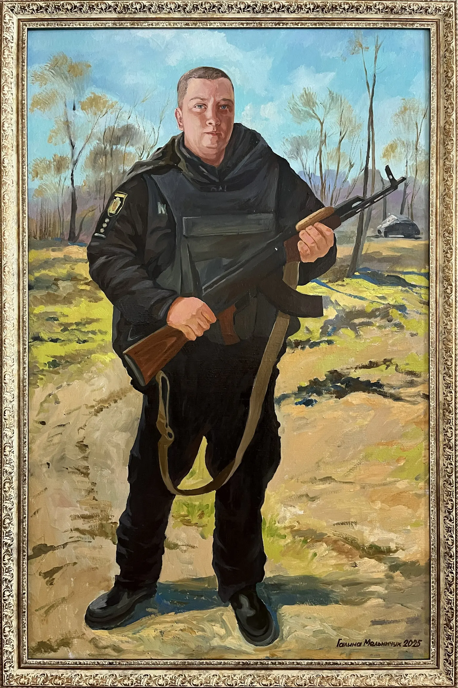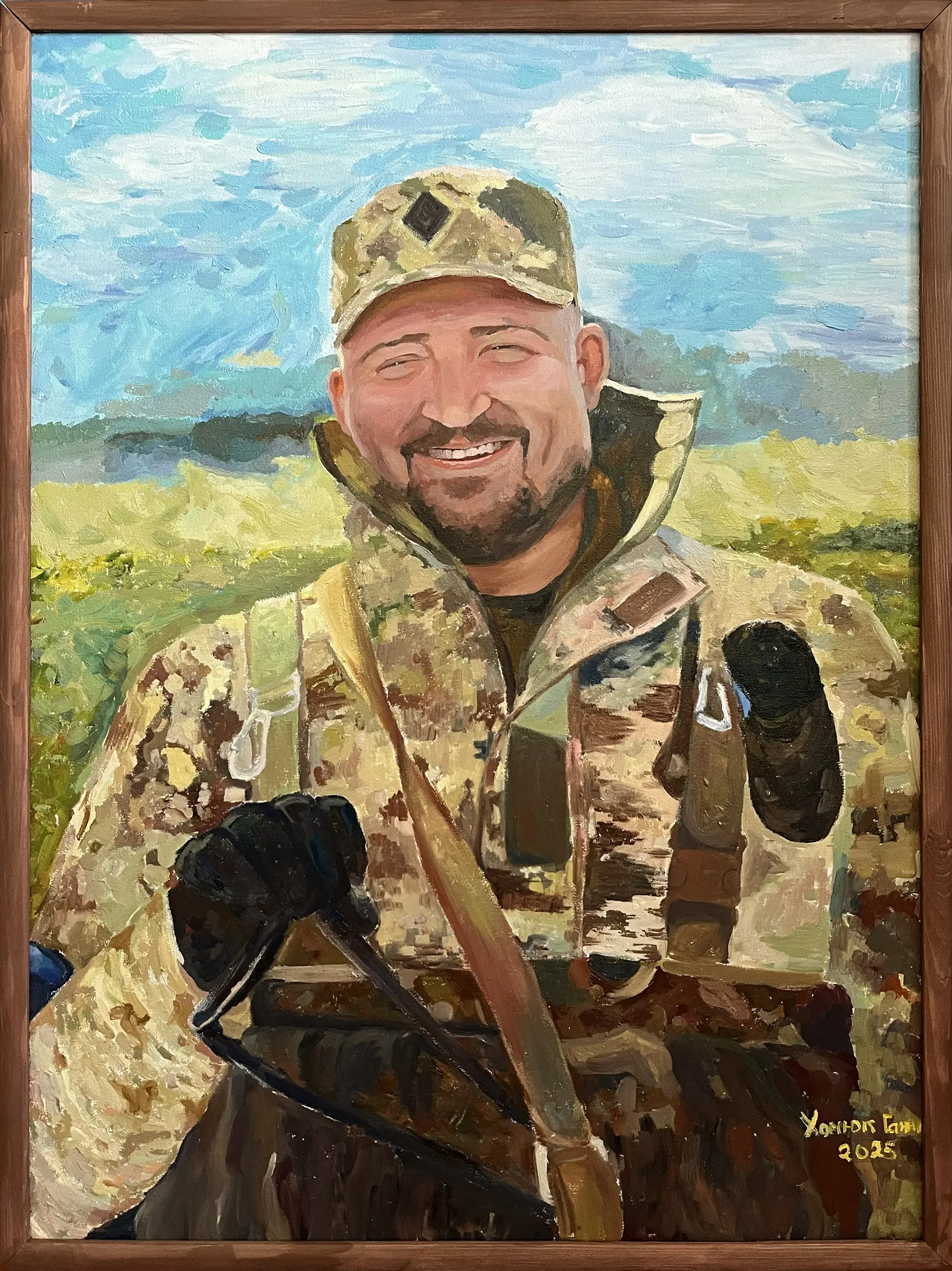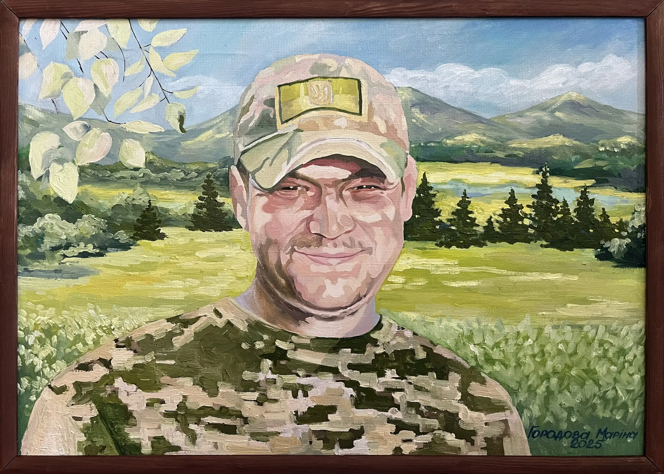 Суворий, дисциплінований, відповідальний, добрий, працелюбний, освічений, організований і сильний духом. Так пишуть про Олександра Олександровича Сербієнка. Люблячий батько та чоловік, просто хороша людина. Я мала честь відтворити його образ на полотні як Героя війни, як людину, що захищала територіальну цілісність України, була вірна військовій присязі, яка не побоялася і стала захищати свою сімʼю, свою країну, кожного з нас до останнього.