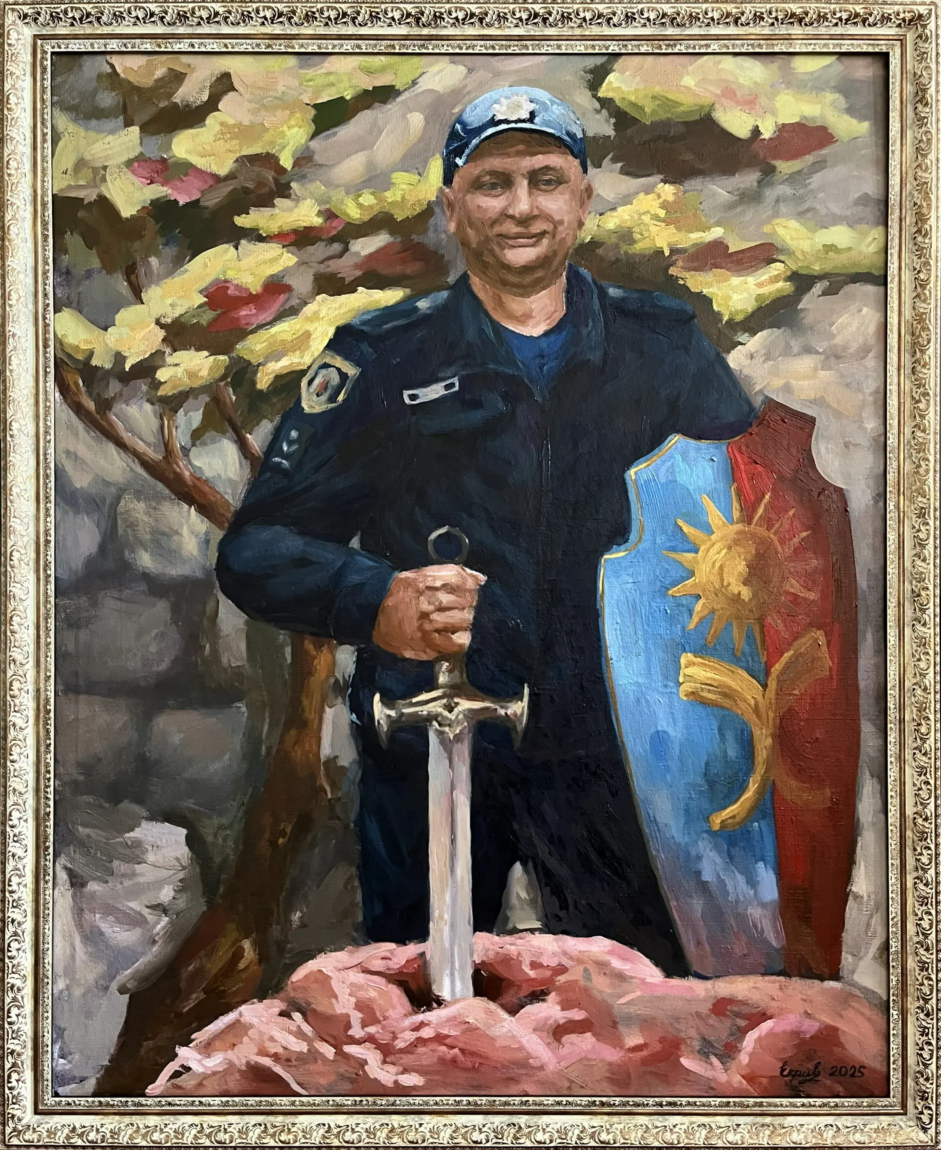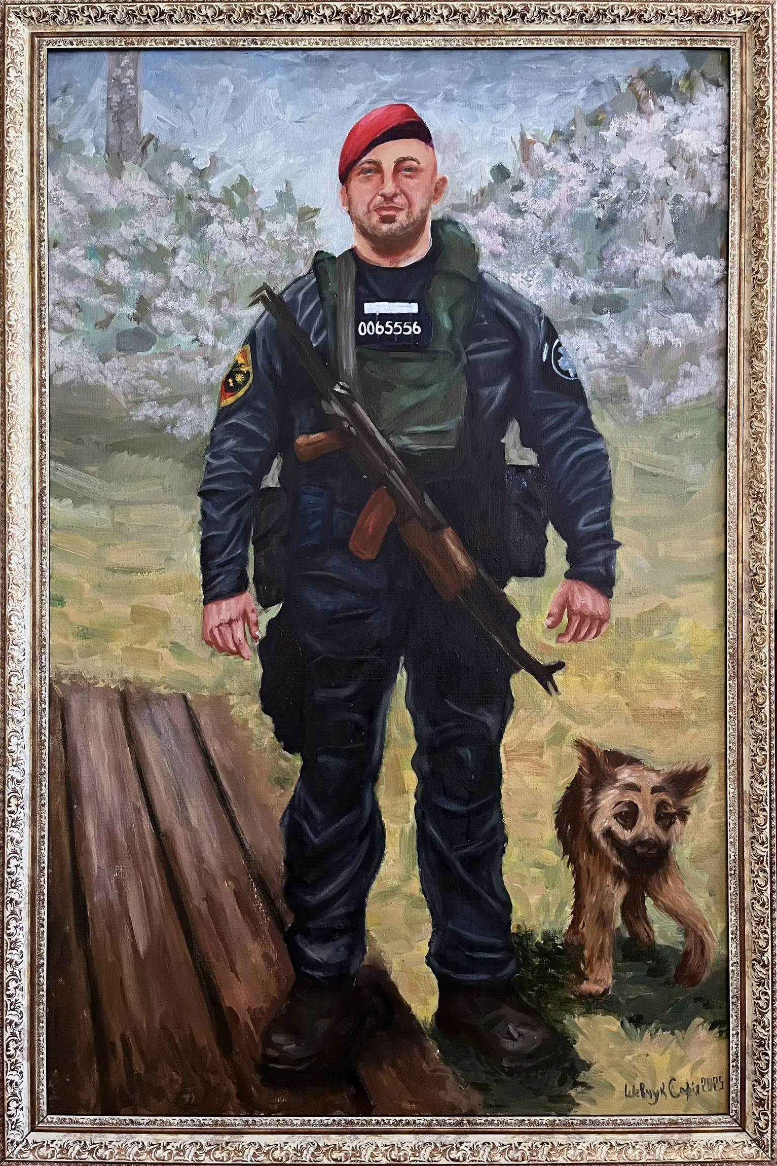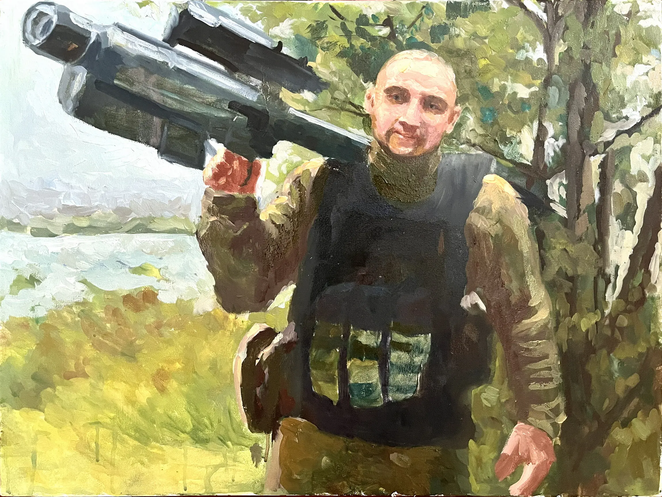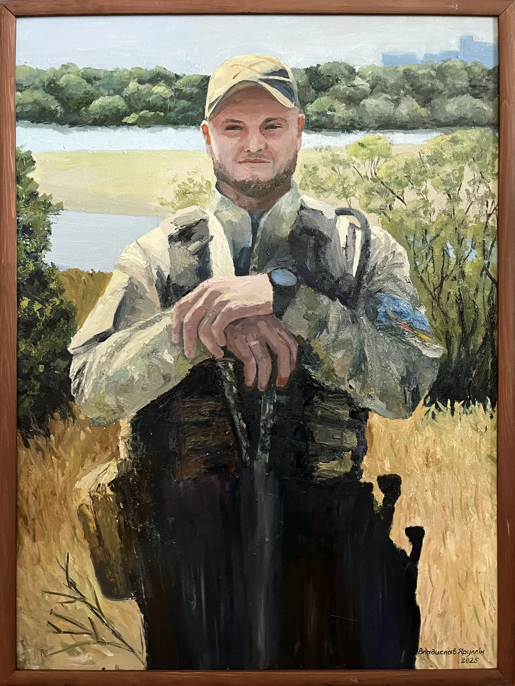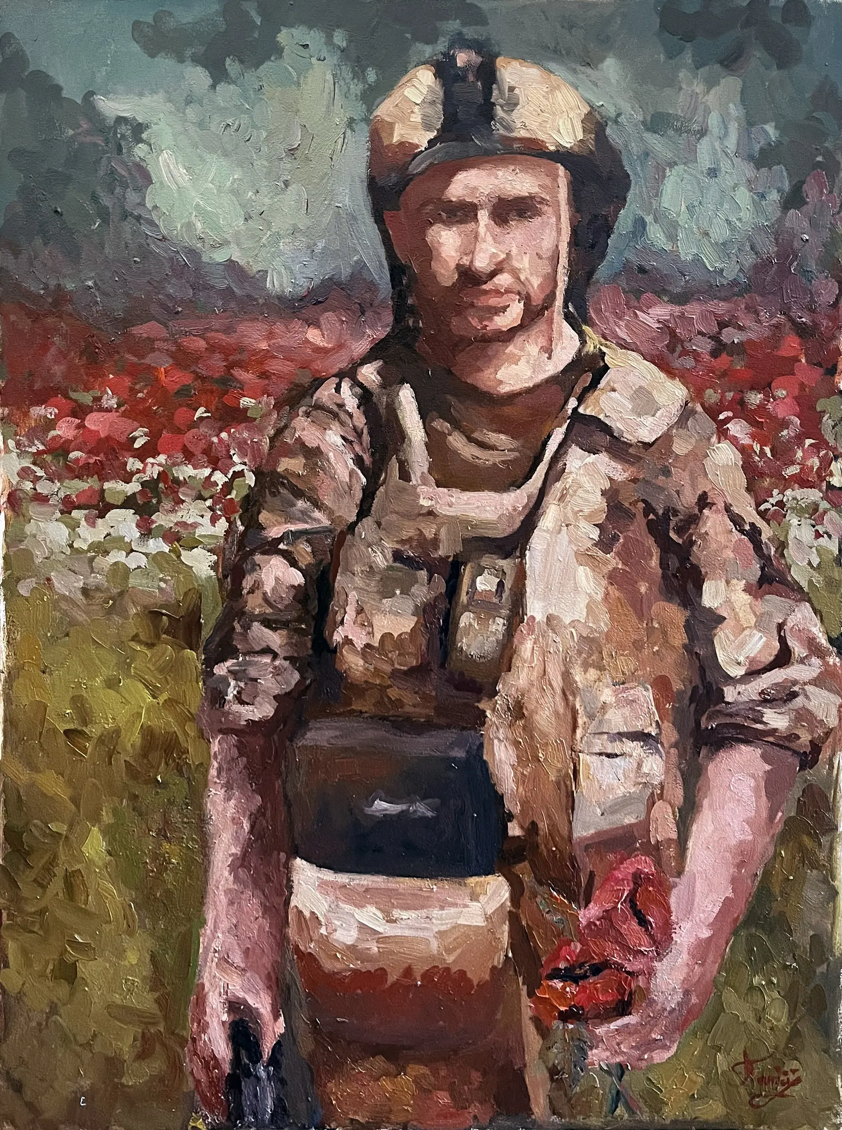 Суворий, дисциплінований, відповідальний, добрий, працелюбний, освічений, організований і сильний духом. Так пишуть про Олександра Олександровича Сербієнка. Люблячий батько та чоловік, просто хороша людина. Я мала честь відтворити його образ на полотні як Героя війни, як людину, що захищала територіальну цілісність України, була вірна військовій присязі, яка не побоялася і стала захищати свою сімʼю, свою країну, кожного з нас до останнього.
