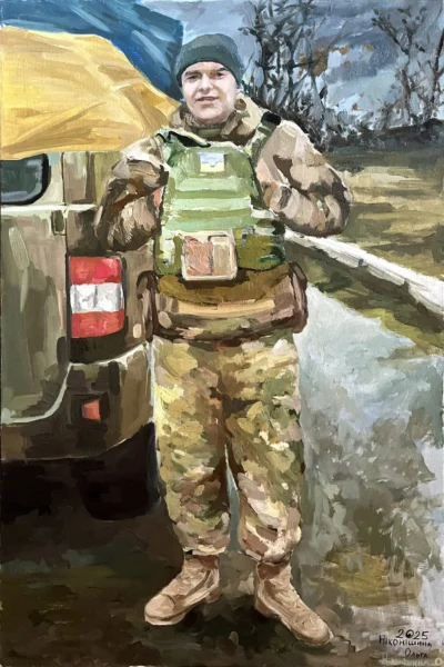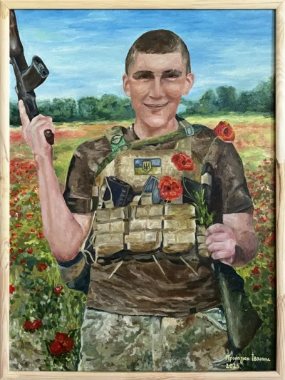 Коли я знову вирішила взятися за написання портрету воїна, переглядаючи фото мої очі зустрілися з поглядом, що одразу ніби доторкнувся до мого серця. Побачивши такого молодого, але такого відважного і героїчного хлопця, я одразу зрозуміла, що маю написати саме його портрет.